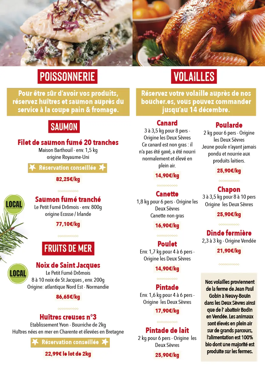 Commandez les huîtres et le saumon auprès du service pain & fromage, et la volaille et les spécialités bouchères auprès de la boucherie. Vous pouvez commander votre volaille jusqu’au 14 décembre.